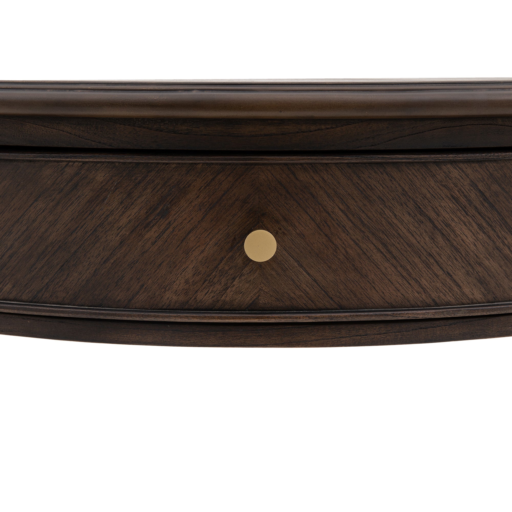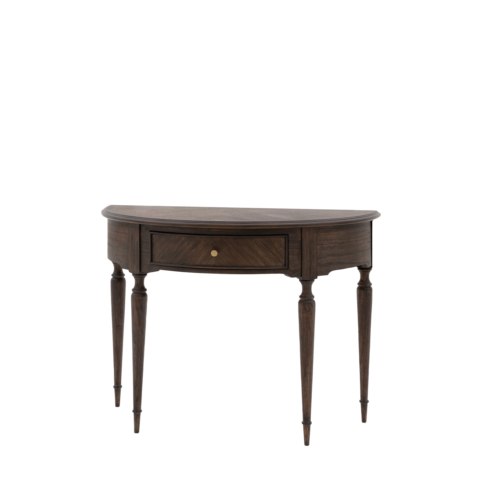 With a sophisticated half-moon shape, this console table is perfectly suited to bedrooms, hallways or any living space where you want to add a timeless elegant style with a modern touch. Offering a ‘new traditional’ look, this stunning console table features beautiful marquetry and inlaid book-matched Mindy wood veneers & solid woods. The satin brass drawer pulls and turned spindle legs adding final elegant finishing touch.