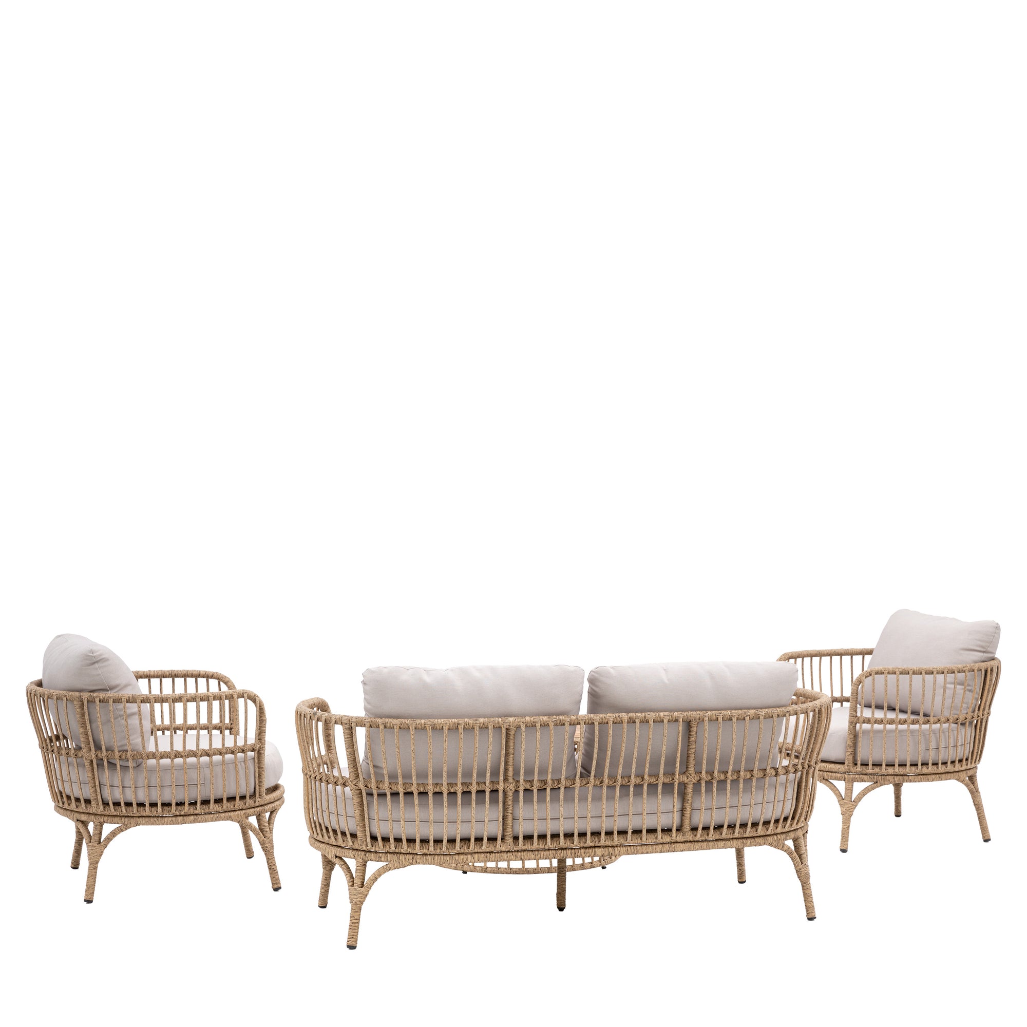 Boho inspired for the ultimate chilled out summer this lounge set features 2 stunning woven look armchairs, a 2 seater sofa and a round Acacia wood topped coffee table. The steel frames are wrapped with 9mm brown weaving for a natural look that will last outdoors, added comfort comes from the soft grey UKFR foam cushions.