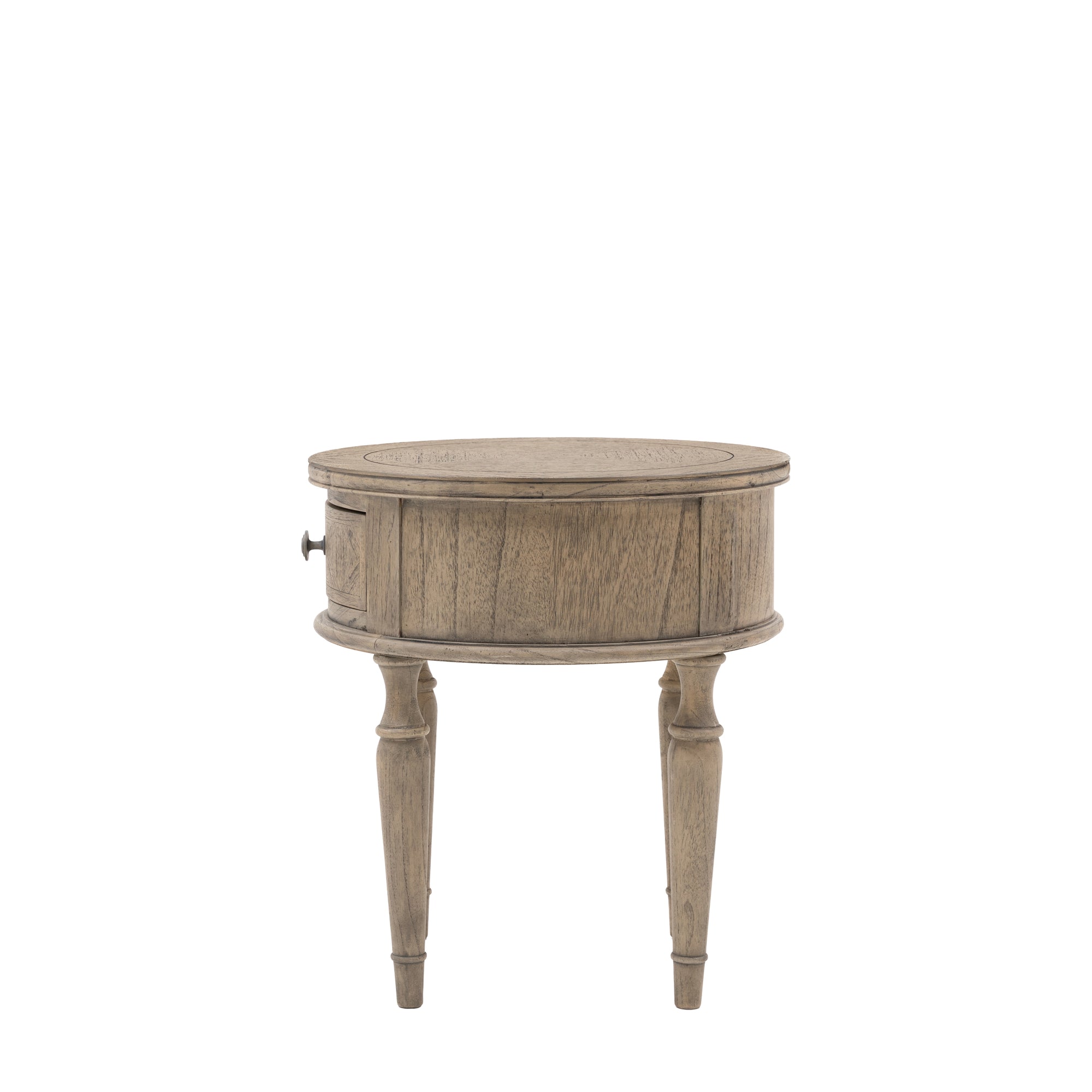 With a nod towards the french colonial style this round side table is made from mindy ash and features parquet inlaid vaneer work in a lightly brushed natural finish with single drawer.