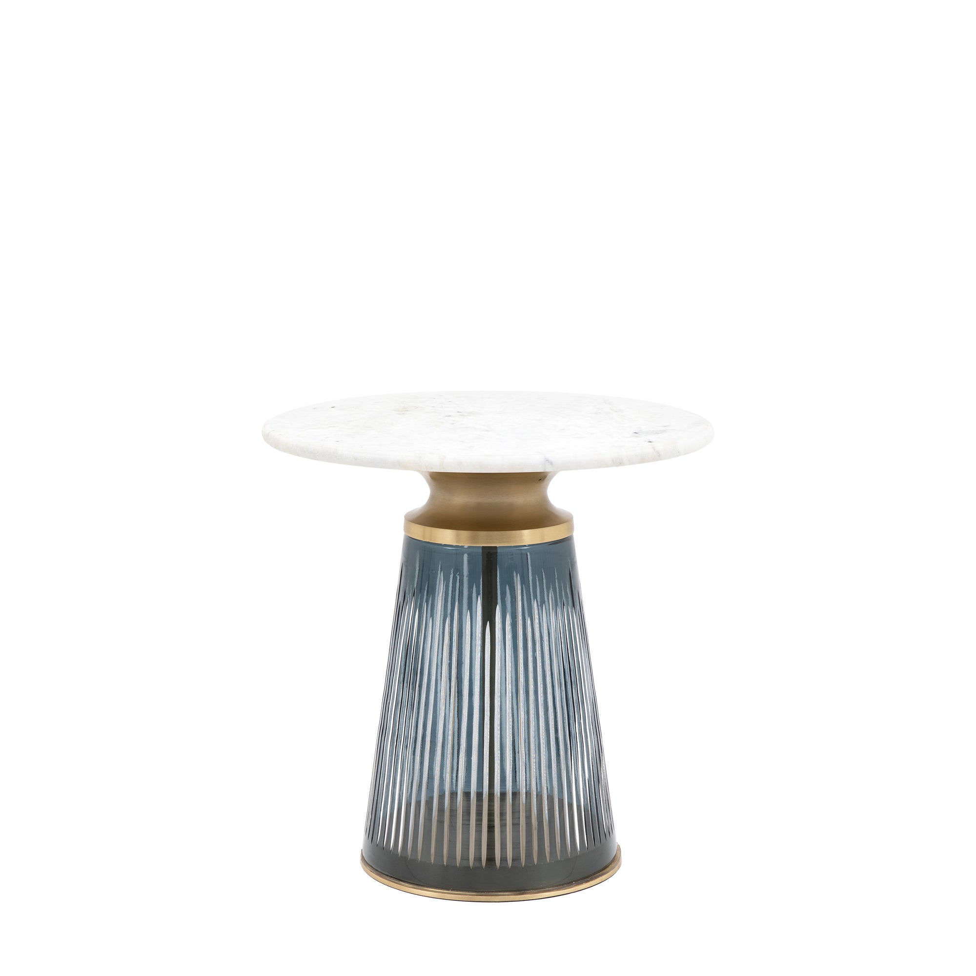 Add some luxe to your room with this unique side table. The incredibly stunning blue glass base features a unique design of liner striations which is not to be outdone by the metal collars and the ultimate in luxury, a white marble table top. Also available in a dusk toned glass base.