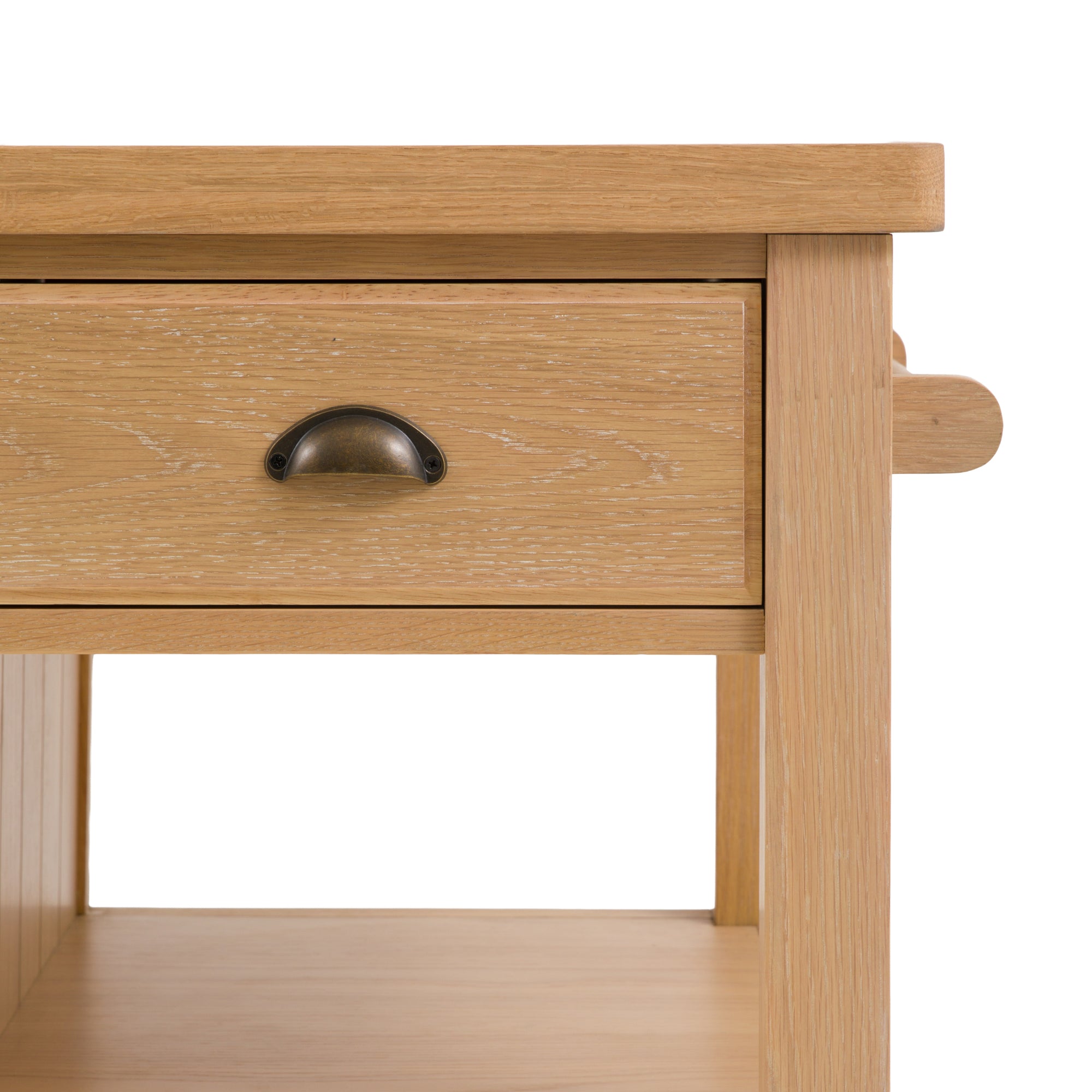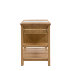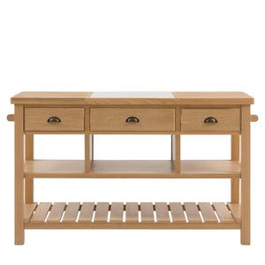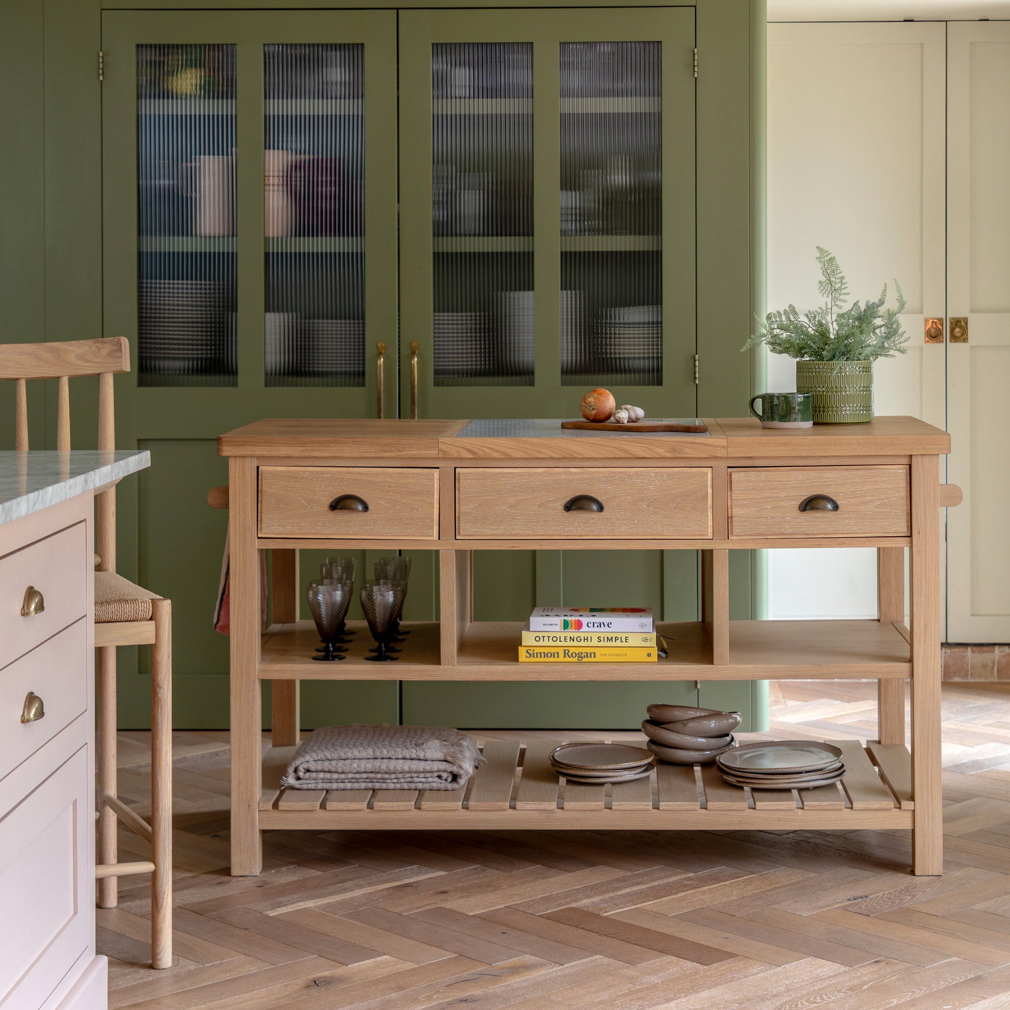 Add extra space and storage to a kitchen with this traditional inspired kitchen island. With country charm and a natural finish, the 3 drawers and shelves, planked lower shelf, and handy hanging rails add practical storage while the wood and marble inlaid top make for the perfect prep surface. Due to the handmade nature of this product, colour variations may be present.