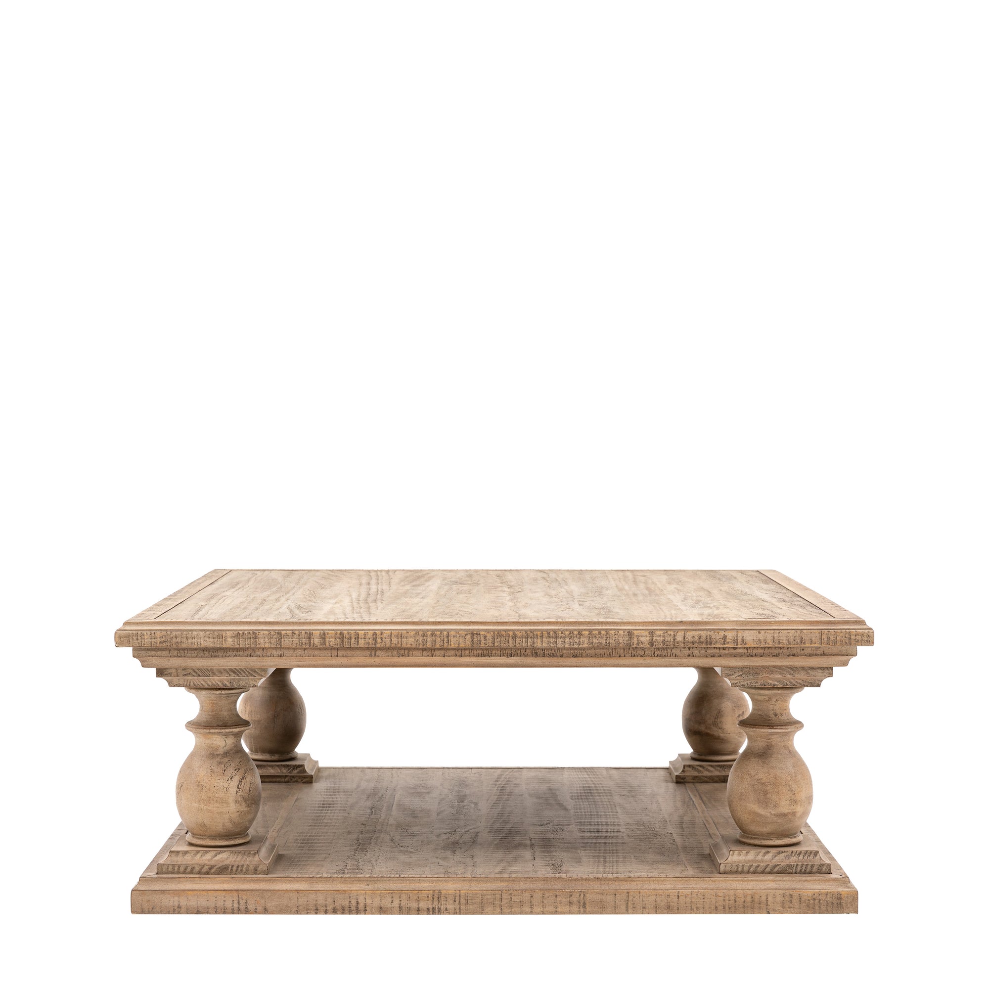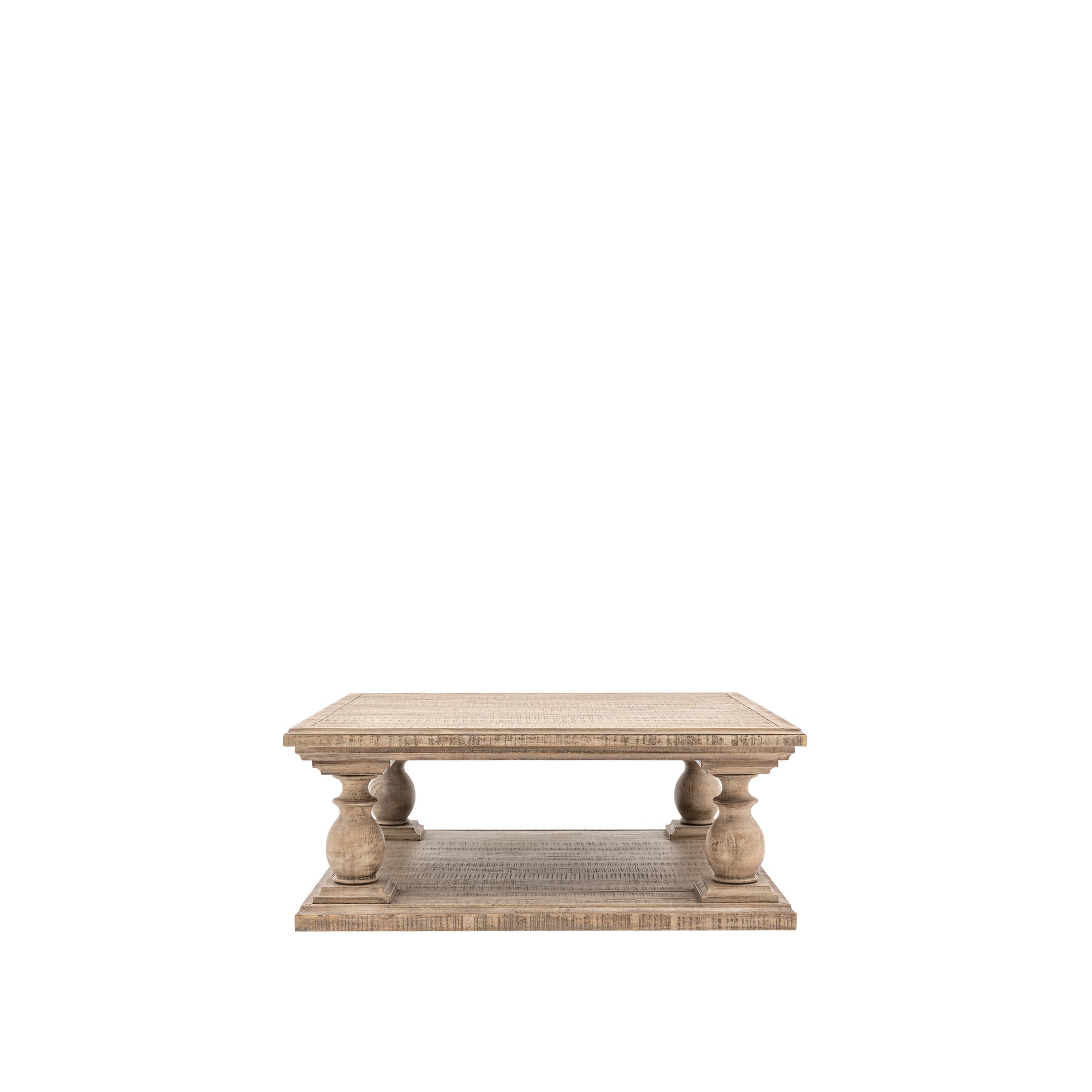 Featuring the clever use of a mill saw which gives characteristic features of cross sawn timber to create a tactile, dramatic finish, this beautiful coffee table offers a sophisticated yet rustic look. It is crafted from North American pine solids and veneers where practical, and features a solid shelf base for added practicality. Matching pieces are available.